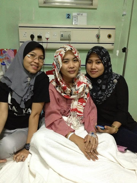 kak na, abang aziz and abg chick memang ader temankan tie lepas dari tie operation. kak ros pun ader. thanks kak ros datang melawat tie. sampai susah susah kena datang naik teksi and tren bagai. tie hargai sangat. cuma time tu tak der gambar kak ros. sebab die tak nak begambar. tak sanggup tengok tie sakit katanyer :)